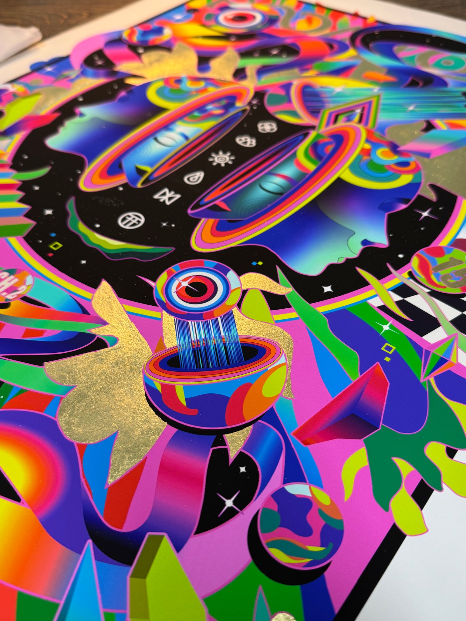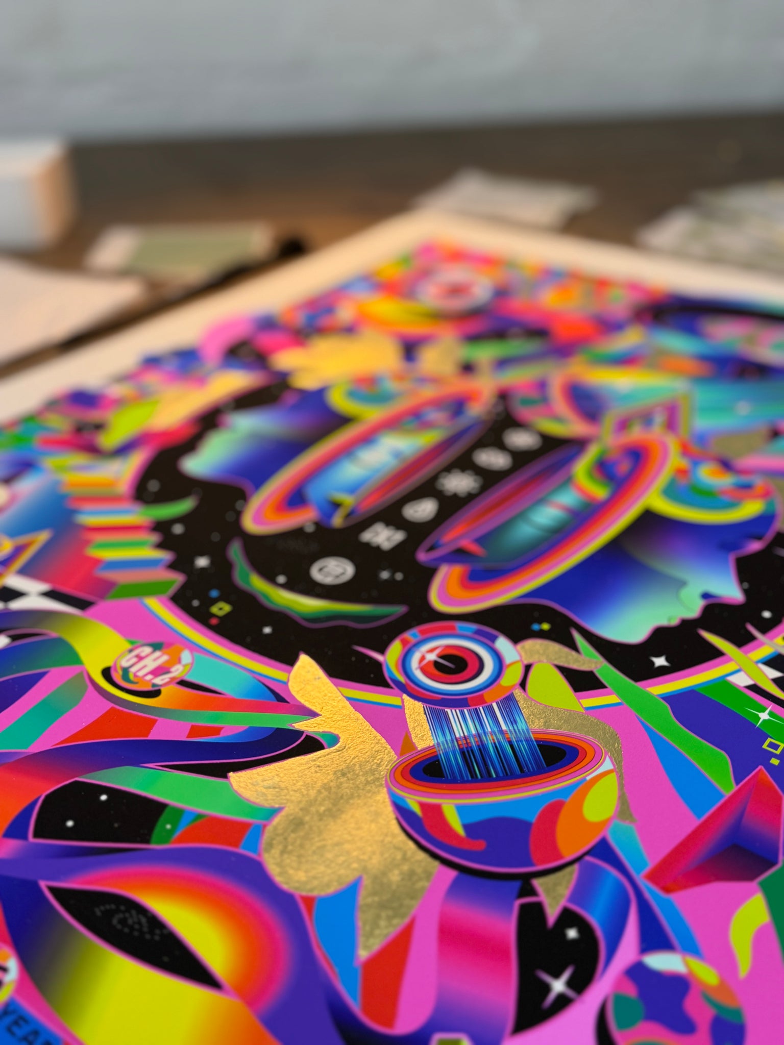 There will only ever be 3 of these as i've adorned my artist proofs (given prior to the the main run of 500 for Boomtown Festival. which sold out couple of years ago. High quality Giclee which has now been hand-embelished with lustrous genuine 24 carat gold leaf.